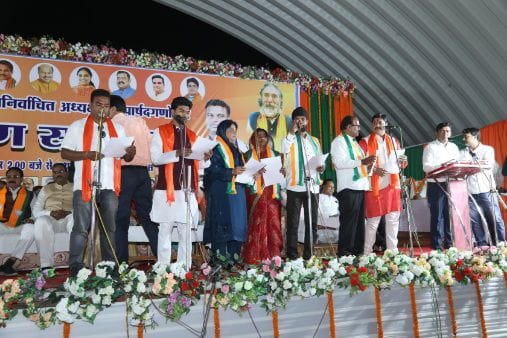 कांकेर। नगर पालिका के चुनाव में ऐतिहासिक जीत दर्ज करने के बाद नवनिर्वाचित अध्यक्ष अरुण कौशिक ने सभी 21 वार्ड पार्षदों के साथ नए बस स्टैंड के सभा स्थल पर विशाल समारोह मे शपथ ग्रहण किया। इस दौरान कांकेर लोकसभा के सासंद भोजराज नाग भी उपस्थित थे। कार्यक्रम में प्रदेश के उप मुख्यमंत्री अरुण साव को भी शामिल होना था लेकिन विधानसभा की कार्यवाही के कारण वे शामिल नहीं हो सके।